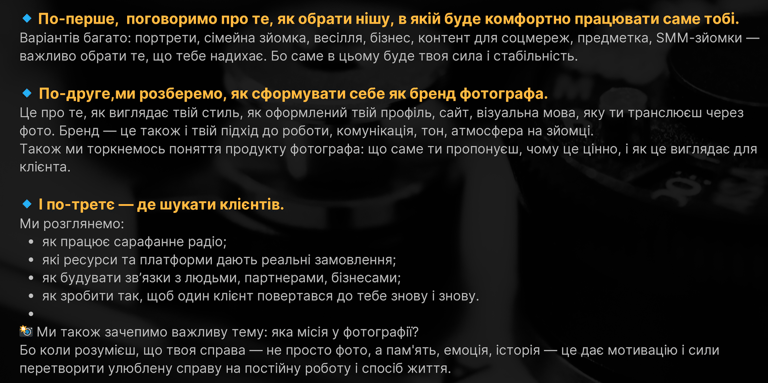 Усі матеріали створені на основі особистого реального досвіду. Я відкривала фотостудії в Україні та Чикаго, а зараз працюю над відкриттям нової студії у Празі. З радістю ділюся знаннями, практичними уроками та інсайтами, здобутими на цьому шляху, щоб допомогти вам уникнути типових помилок і впевнено розвиватися у фотографії.
